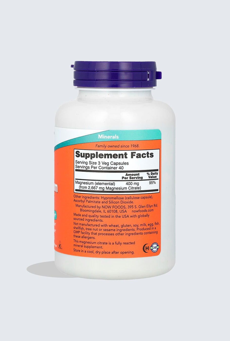 Magnesio en forma de citrato que ayuda a regular la actividad neuromuscular, contribuye al ritmo cardíaco normal y facilita la absorción de calcio y potasio. Presentación: 60–120 cápsulas (1–2 al día según indicación). Apto para veganos y probado según GMP.